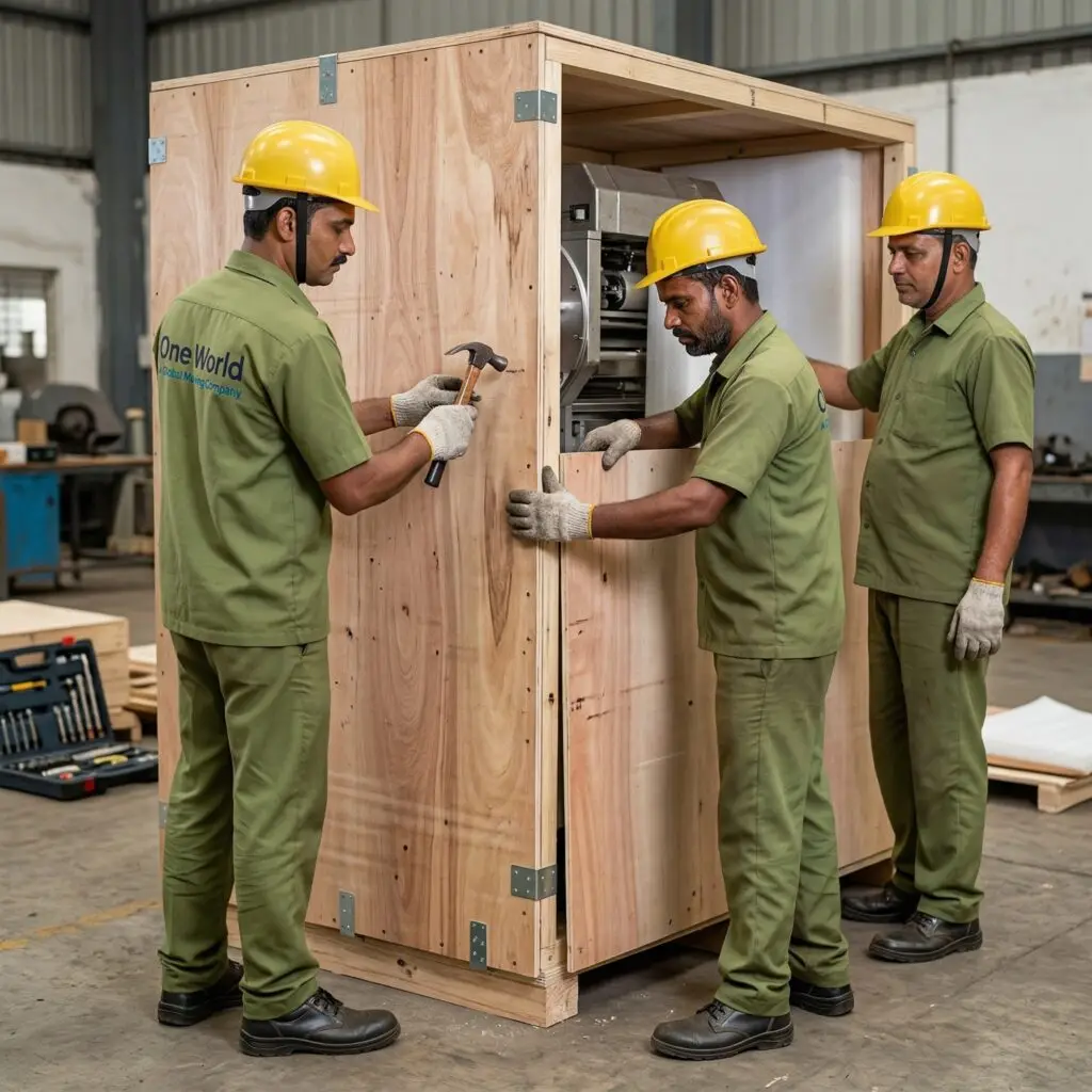 Custom wooden crating, foam padding & anti-vibration packing for sensitive and high-value industrial machinery ensuring safe transit.